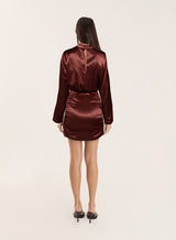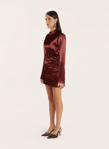 Contemporary design meets timeless elegance in the Odette dress. Crafted from a luxurious satin fabric in a burgundy hue, this design drapes to the natural curves of the body in a flattering silhouette. With a high neck and long-sleeves, it's an elegant option to pair with heels and a simple clutch.