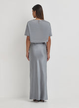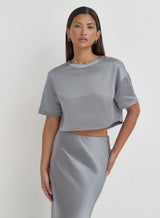 For an elevated staple with a chic twist, the Dara top see's a boxy t-shirt design in a sheen satin esc fabric. Boasting a metallic steel blue hue, this style features a cropped silhouette with dropped shoulders and relaxed finish. For the full look, pair with the Dara skirt.