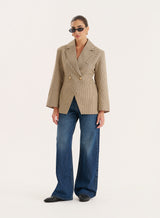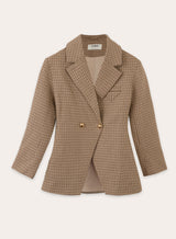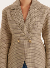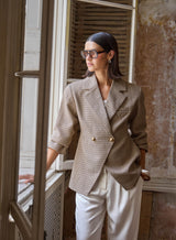 Elevate your wardrobe with the Reese blazer, where sharp tailoring meets bold, contemporary details. Updated in a tonal check print for the new season, it features an exaggerated shoulder and a striking asymmetric button fastening for a modern power look. With its cinched waist and stepped lapel, it's a true statement piece that brings an elevated edge to your everyday style. Complete the look with blue jeans or tailored trousers.