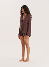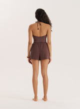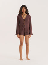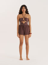A summer essential you can re-wear each year, the Jules beach shorts embrace a comfy, relaxed design. With an elasticated waistband and adjustable tie, they're elevated with tassel detailing for a boho feel. A floaty, thrown on piece in a gorgeous chocolate brown hue, wear them with the matching Jules shirt or your favourite bikini top.