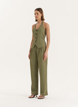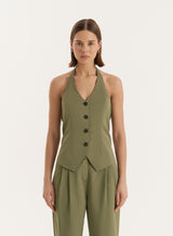 A refreshing update to your tailoring collection, the Sabrina waistcoat features modern, elevated details to take you from day-to-night with ease. In a halter neck design with contrast button-up fastening, this waistcoat is made from a lightweight, viscose-blend fabric in a rich khaki green hue (the ultimate spring colour). With a notched hem finish that creates a tailored feel, we're pairing this with the matching Sabrina trousers for a head-to-toe look.