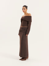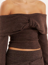 Crafted from an ultra-soft knitted fabric, the Selene top blends comfort with sleek sophistication. In a timeless chocolate brown colourway, this off shoulder top is elevated with a fold over neckline, long sleeves and a knotted detail. Designed to allow an effortless transition from day to night, pair with the matching Selene skirt for a look that's stylish and intentional.