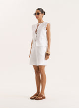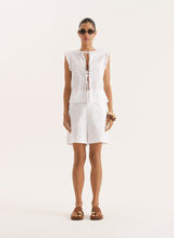 In a pure cotton fabric, the Heidi summer shorts are designed with versatility and special summer moments in mind. In a timeless Bermuda style with intricate stitch detailing, they have a mid-rise design with slip pockets and a zip hook-and-eye fastening. A slightly wide leg shape, wear with the matching broderie tie front top or style back with basic vests for a casual summer look.