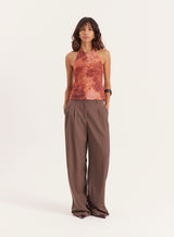 For long summer days that turn into unforgettable evenings, the Saskia halter top has end-of-summer dressing covered. In a rust tie dye print, it features a flattering high neck halter style neckline and exposed back. In a double layer mesh fabric for a stretchy fit, it sits at hip length for an elongating fit. Style with a cream satin skirt.