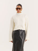 Crafted from a luxurious cable knit fabric, the Ethel jumper is a versatile and polished wardrobe addition. A fold over turtleneck makes this piece perfect for styling on chillier days, while wide sleeves and a cropped cut give this jumper it's refined edge. Elegant yet comfortable, the Ethel jumper pairs perfectly with the Carys skirt for a refined day-to-night look.