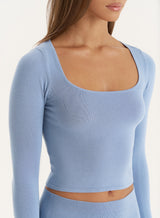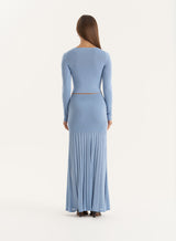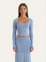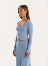 Coming in a dreamy powder blue, the Nancy crop top is an elevated addition to your spring summer wardrobe, seeing you from day dressing to evening wear. In a soft knit fabric, the scoop neckline creates a flattering silhouette, with long sleeves for those in-between weather moments. Creating a body-skimming, fitted silhouette, wear with the matching skirt for an effortless co-ord look.