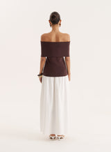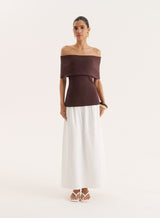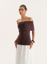 A modern, feminine design, the Marsha knitted top strikes the perfect balance between simple styling and everyday elegance. In a stretchy, knit fabric, it's designed with a strapless, Bardot neckline with a deep fold over design that's super flattering on all body shapes. In a rich chocolate brown hue, it's the perfect going out top to wear with a simple satin skirt and minimal accessories.