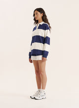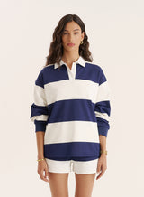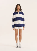 An athleisure piece to wear all season, the Alba polo sweatshirt embraces a classic design with long sleeves, a button polo collar and ribbed trims. Crafted from a cotton fabric to a relaxed, oversized fit, it brings a heritage feel with a bold navy and white stripe print. Layer over cycling shorts for airport outfits or morning coffee runs.