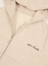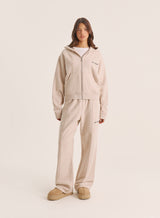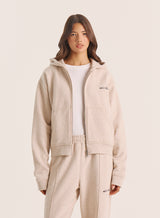 Introducing your new athleisure look for this season, cosy up in the Collena zip hoodie. Designed in tones that hit all your autumn moodboard goals, an oatmeal marl colourway is enhanced with burgundy script embroidery, making this the ultimate elevated basic. With cuffed sleeves, cosy pockets, a zip fastening and classic hood design, you can layer for warmth while looking effortlessly cool. Cropped to the perfect flattering length, complete the look with the matching Fergie joggers and accessories.
