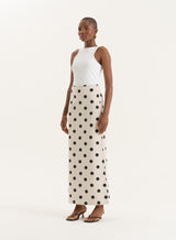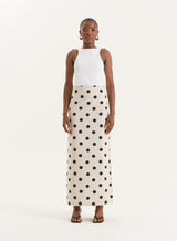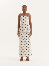 A statement making design, the Clementine maxi skirt is a fresh take on your go-to summer pieces. In a luxe linen fabric and straight silhouette, it boasts an all-over polka dot print bringing all the summer feels for your holiday plans and special events. Style it back with an everyday vest or dress it up with the matching polka dot print bandeau top.