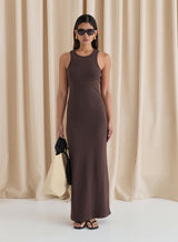 In a high quality double layered jersey, the chocolate emel dress is a staple piece. In a midaxi silhouette, the design features a central 4th embroidery with ribbed hem details and a racer back finish. Invest in your everyday with this timless style.