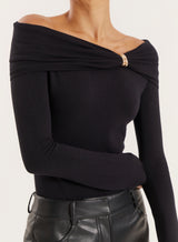 The perfect addition to a capsule eveningwear wardrobe, meet the Virgo top in a sophisticated black colourway. With an elegant off-the-shoulder cut, the Virgo top is all in the detail. This long-sleeve style features ruching around the neck and an eye-catching gold hardware detail, your new staple for a 'jeans and a nice top' look.