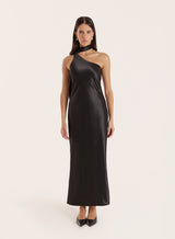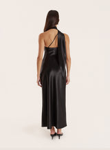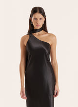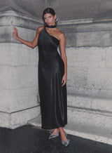 Black Satin One Shoulder Scarf Neck Maxi Dress- Ellen