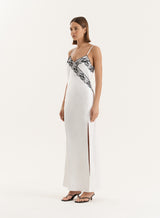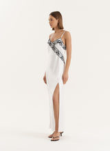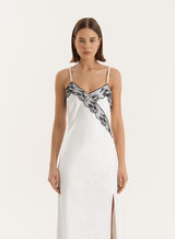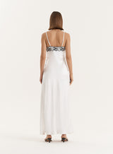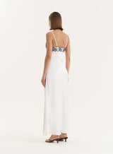 A quietly confident classic that you'll wear all spring summer, the Merida white maxi dress sees a timeless silhouette updated with trend-led detailing. Designed with adjustable spaghetti straps, the contrast black lace trim creates an overlapping, v neckline shape for a flattering fit. Finished with a high leg split and modern drop hem waist, it's effortlessly styled with sandals by day and heels by night.