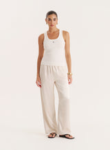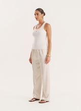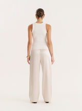 A style that transcends the seasons, the Shelby satin trousers are a true wardrobe staple. In a soft satin fabric, they come in a relaxed wide leg shape with a drawstring elasticated waist for added comfort. In a tonal cream hue - style them with an everyday vest in summer or a soft knit for cooler days.
