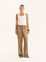 Taking you from summer styling to trans-seasonal dressing, the Shelby satin trousers are a true wardrobe staple. In a soft satin fabric, they come in a relaxed straight leg shape with a drawstring elasticated waist for added comfort. In a gorgeous mocha hue - style them with an everyday vest in summer or a soft knit for cooler days.