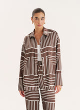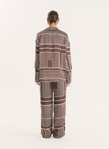Updated for the new season in a striking chocolate hue, the Amira shirt is an effortless option to add to your everyday collection of comfortable and elevated pieces. The button front design comes in a soft satin fabric in an abstract stripe print. Finished to a relaxed fit with long sleeves, simply style with the matching Amira trousers for an elevated everyday look.