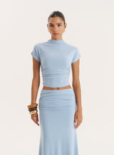In a soft sky blue, the Elouisa top sees a fitted bodice and ruched detailing for a truly elevated feel. Crafted in a double layered jersey for a supportive, stretchy fit, it comes with a high neckline and short sleeves. Pair with the Elouisa skirt for a dreamy occasion co-ord outfit.