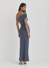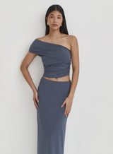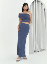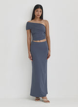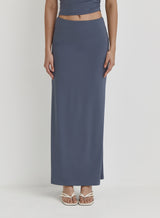 The Kaitlyn skirt boasts a muted cornflower blue hue in a soft double layered jersey fabric that creates a figure skimming silhouette. This skirt sits at low rise and falls to the floor, creating a dramatic yet elegant style. Pair with the matching Katilyn top for the full look.