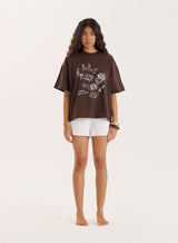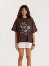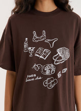 In our much-loved oversized silhouette, the Benni beach t-shirt is the ultimate throw-on tee for holiday season and beyond. Crafted in a soft, durable cotton fabric, it features dropped short sleeves and a classic crew neckline. Coming in a gorgeous chocolate brown hue, it's finished with a contrast leisure club print that captures the essence of summer. Wear with everything from linen shorts to maxi skirts.