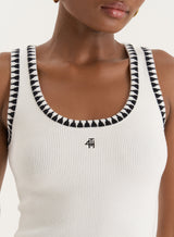 Embroidered with our iconic 4th logo detail across the chest, the cream Ruben vest top sees our everyday vest design updated with a scoop neckline and black contrast stich detailing across the neckline and straps. In a soft, knitted ribbed fabric, wear it with literally all your summer wardrobe from day to night.