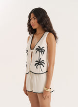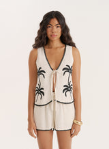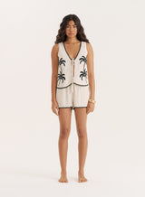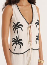 An elevated piece, our Kenna tie up top has been designed with relaxed tailoring in mind. Featuring a casual waistcoat silhouette in a summer linen-blend fabric, this style ties at the front and boasts an ecru hue with contrast palm print embroidery.